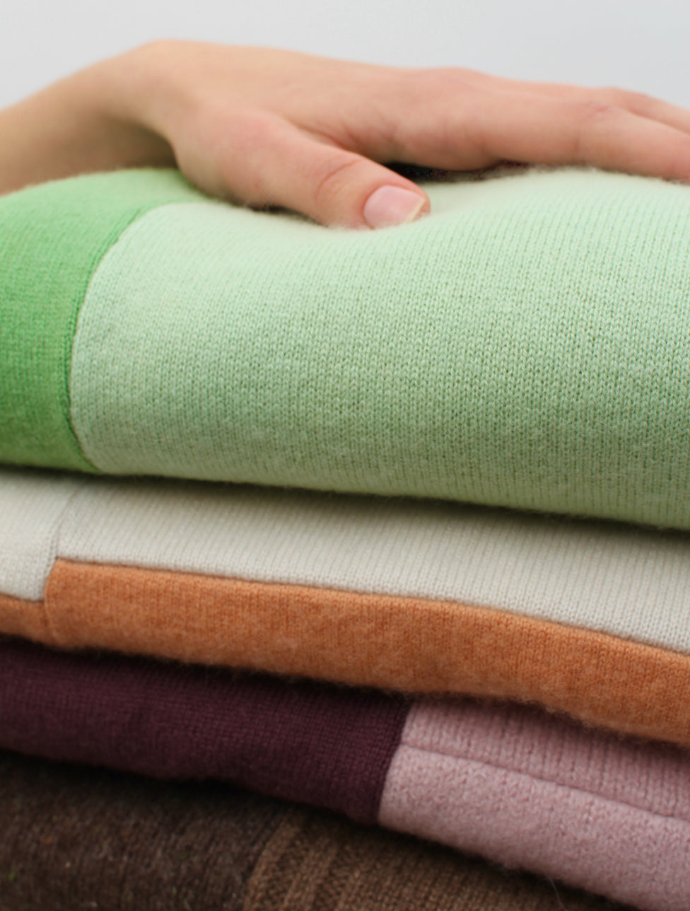 Nous créons à partir de tricots et de tissus résistants et durables. Les matières que nous cousons sont recyclées. Nous leur donnons une nouvelle vie tout en conservant leur plus haute qualité. Nous créons des produits dans l'esprit du zéro déchet, en utilisant au maximum chaque morceau de matière.