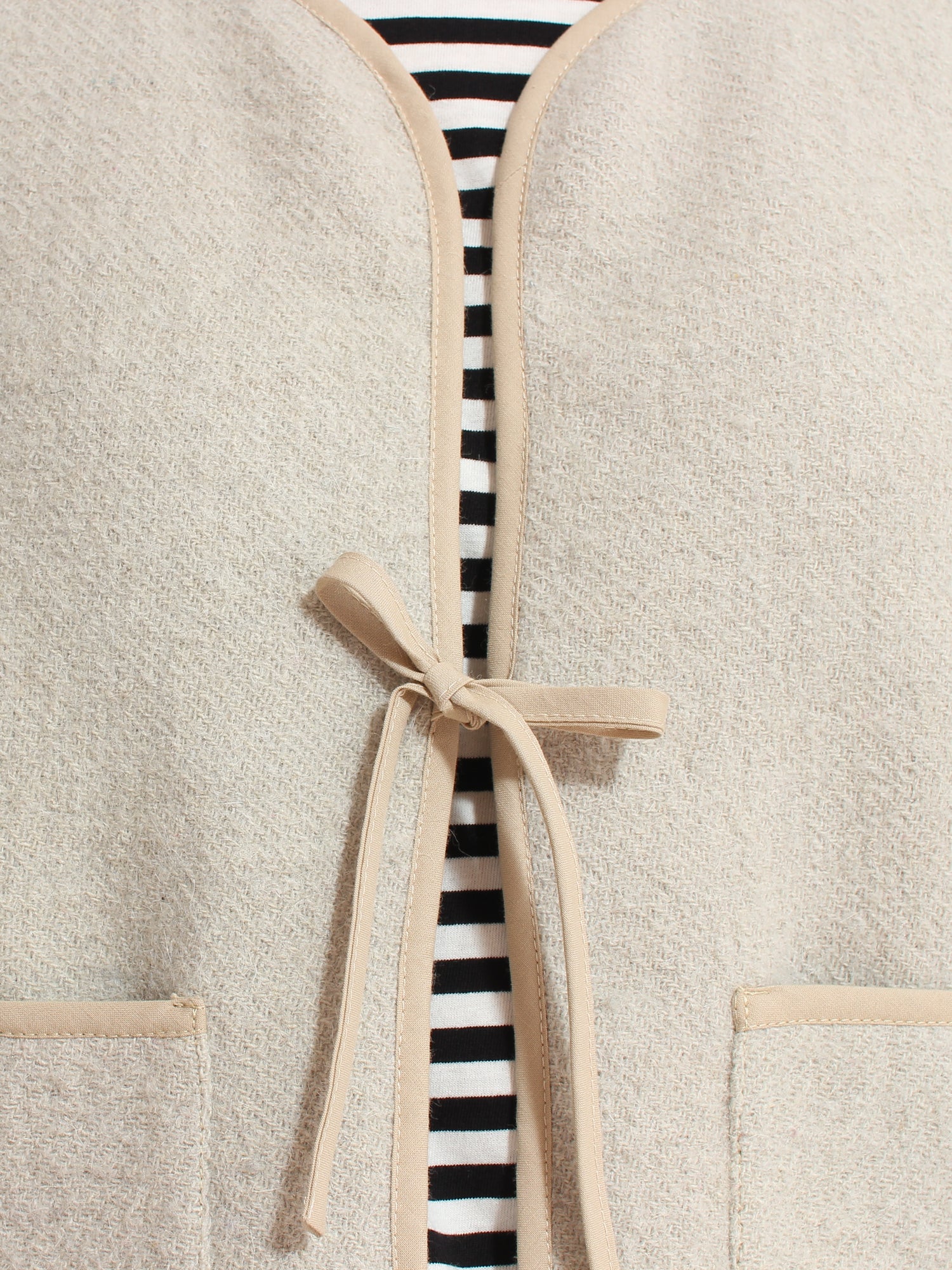 Kamizelka wiązana na kokardkę wykonana z miękkiej wełny. Kamizelka ma luźny krój, jest miękka i ciepła. Wykonana z odzyskanego wełnianego koca w kolorze ciepłej szarości.