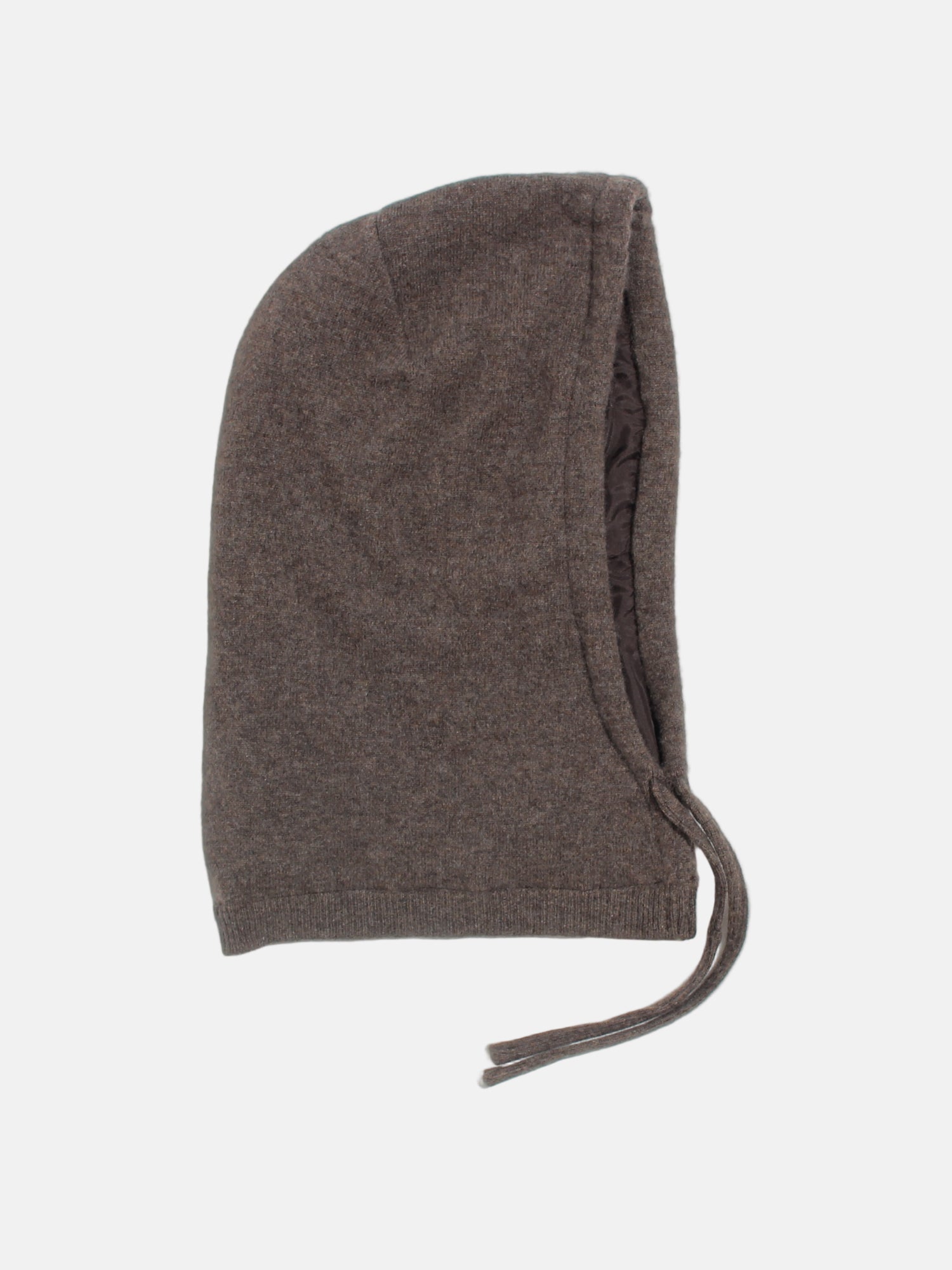 Wygodny i ciepły kapturek, balaclava wykonany z kaszmiru z jedwabną podszewką w kolorze brązowym. Kapturek miękko otula głowę i szyję.