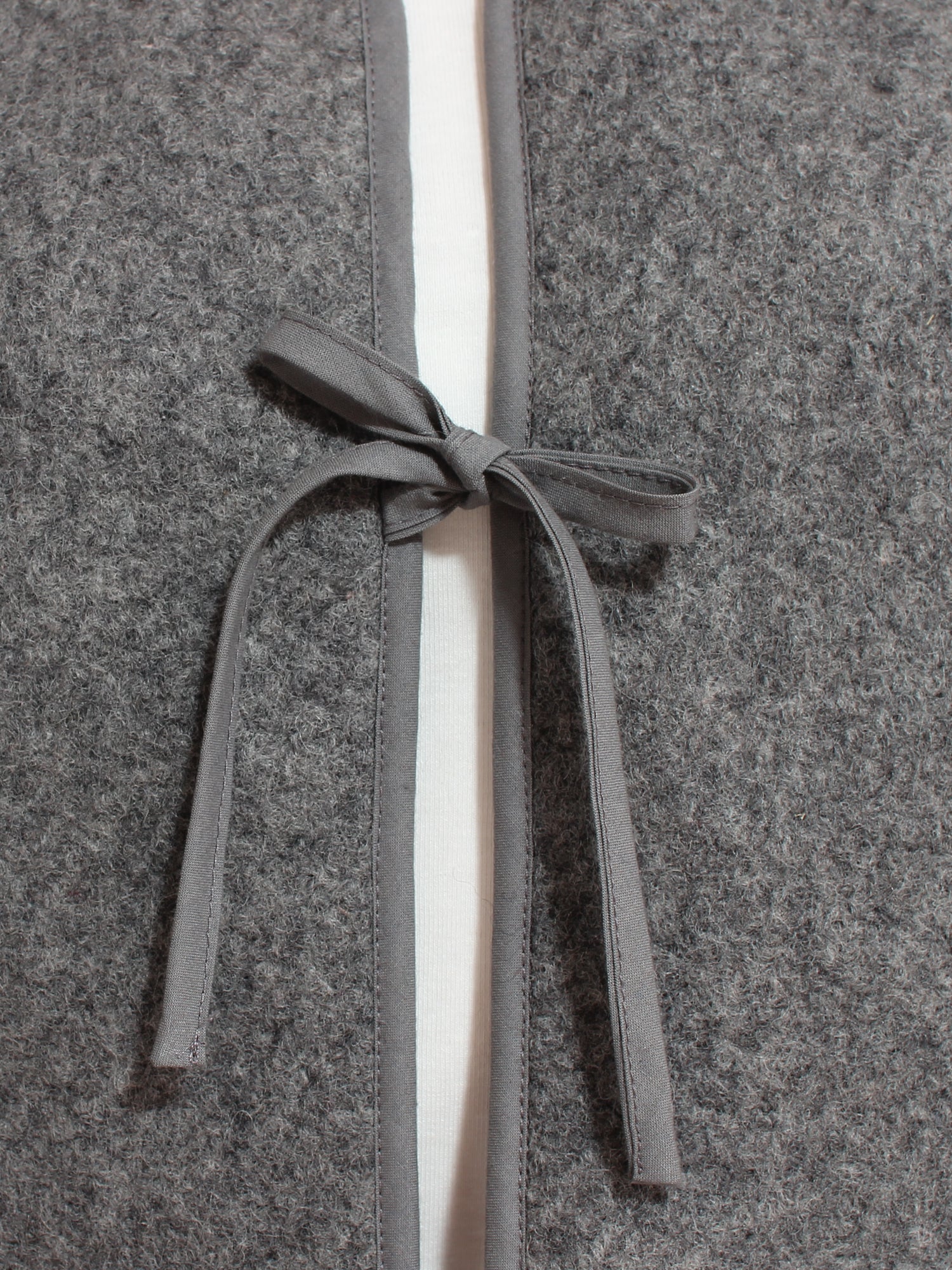 Kamizelka wiązana na kokardkę wykonana z miękkiej i grubej wełny. Kamizelka ma luźny krój, jest miękka i ciepła. Wykonana z odzyskanego wełnianego koca w kolorze szarym.