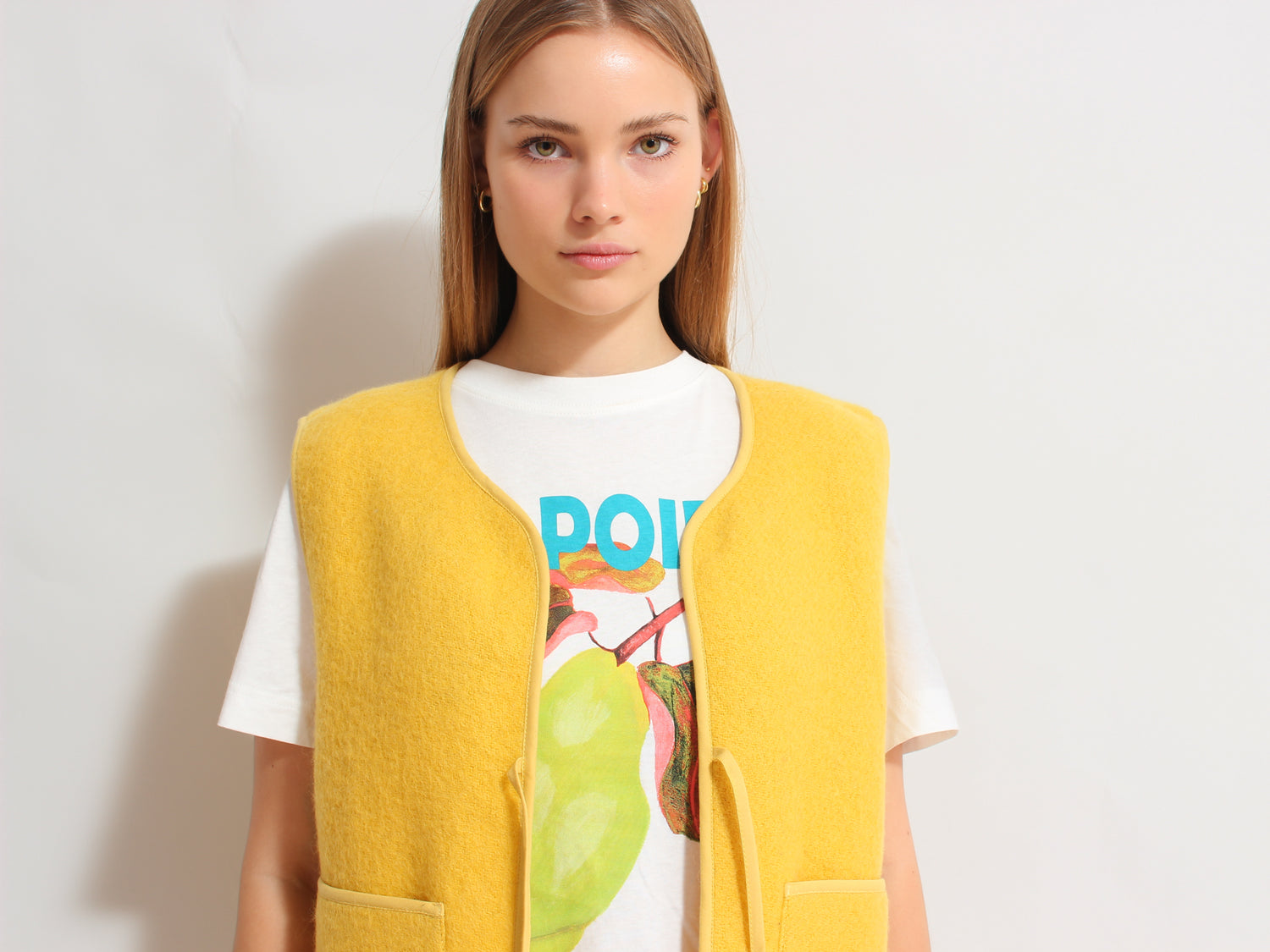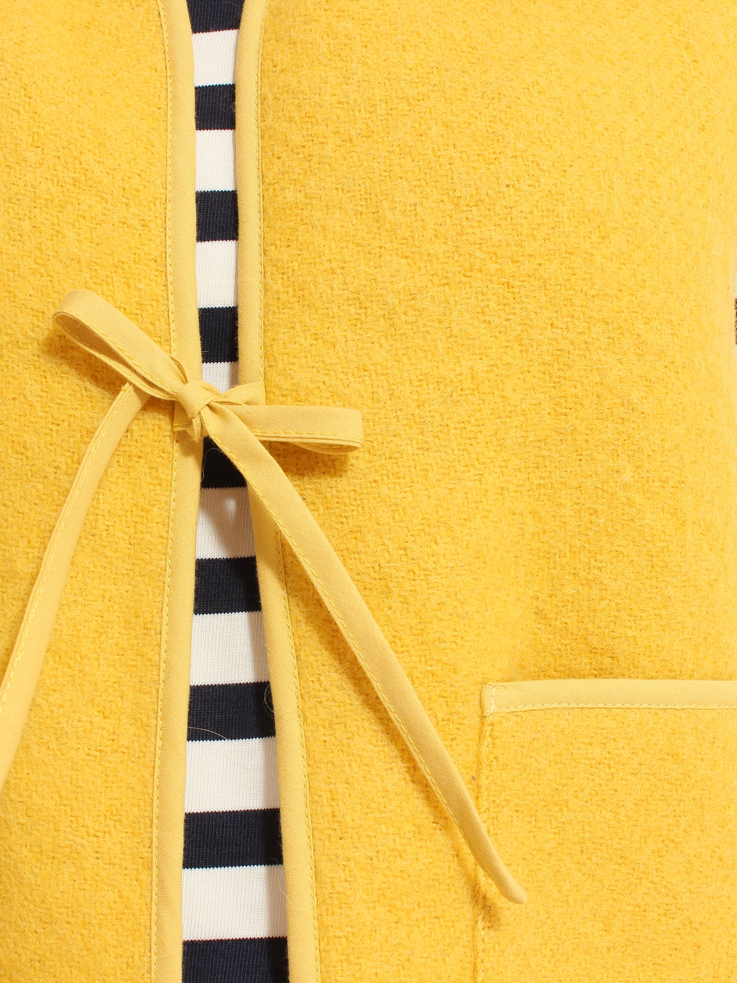 Kamizelka wiązana na kokardkę wykonana z miękkiej i grubej wełny. Kamizelka ma luźny krój, jest miękka i ciepła. Wykonana z odzyskanego wełnianego koca w kolorze żółtym.