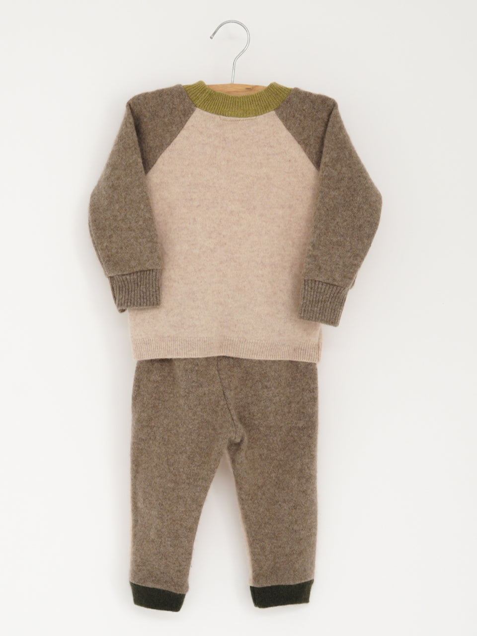 Przytulny komplet składający się ze sweterka i spodenek wykonanych z kaszmiru. Sweterek wkładany przez głowę, miło otula dekolt dziecka. Spodenki mają luźny krój, są miękkie i ciepłe.